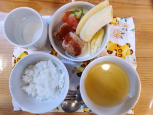 ☆軟飯☆バナナ☆豆腐ハンバーグ☆大根とわかめの味噌汁☆ポテトフライ☆胡瓜とトマトのサラダ