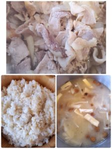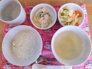 ☆七倍粥☆玉葱の味噌汁上澄み☆鶏ひき肉のキャベツ煮☆ポテトサラダ