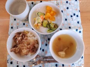☆豚丼(軟飯)☆きのこの味噌汁☆キャベツと胡瓜のおかか和え☆ポテトサラダ☆オレンジ