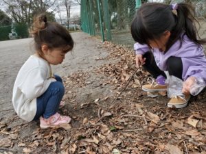 「じゃあ次俺鬼ね‼」と遊びのルールを決めて自分たちでどんどん展開していく姿が見られました✨落ち木を集めてなにかイメージしている物に見立てたりと工夫しながら遊びを楽しんでいました♪
