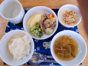 【1歳児】☆軟飯☆塩肉じゃが☆もずくえのきの味噌汁☆オクラときゅうりのおかか和え☆りんご