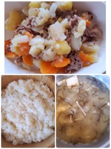☆塩肉じゃが☆玄米入りご飯☆もずくえのきの味噌汁