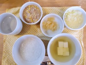 【後期】☆7倍粥☆豆腐の味噌汁上澄み☆ツナコーンのだし煮☆ポテトサラダ☆すりりんご