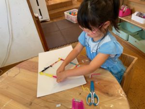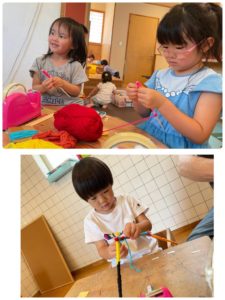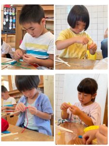 割りばし4本分に毛糸を巻いて、最後は4本を好きなように繋ぎ合わせ画用紙に貼りつけ完成です!みんな達成感を味わっていました☆