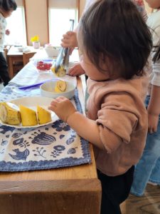 0歳児の子どもたちにとってはトングでつかんでよそる事は難しいことだと思います。