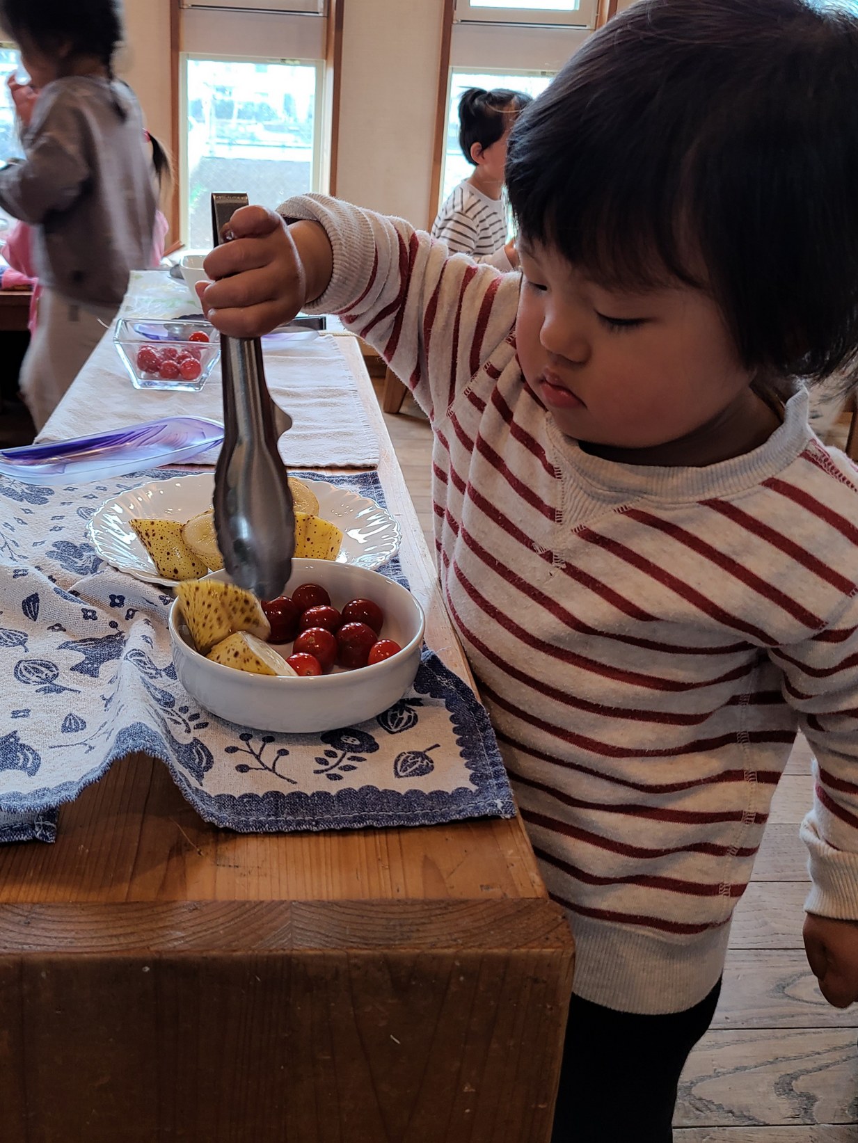 小さなミニトマトもそーっと崩れないように・・・0歳児の男の子もトングを使って・・・