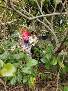 夢中になって椿のつぼみを拾い集める子ども達。