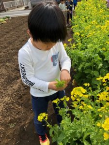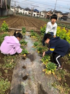お散歩の後、大きい子は菜花と大根の最後の収穫に向かいました。