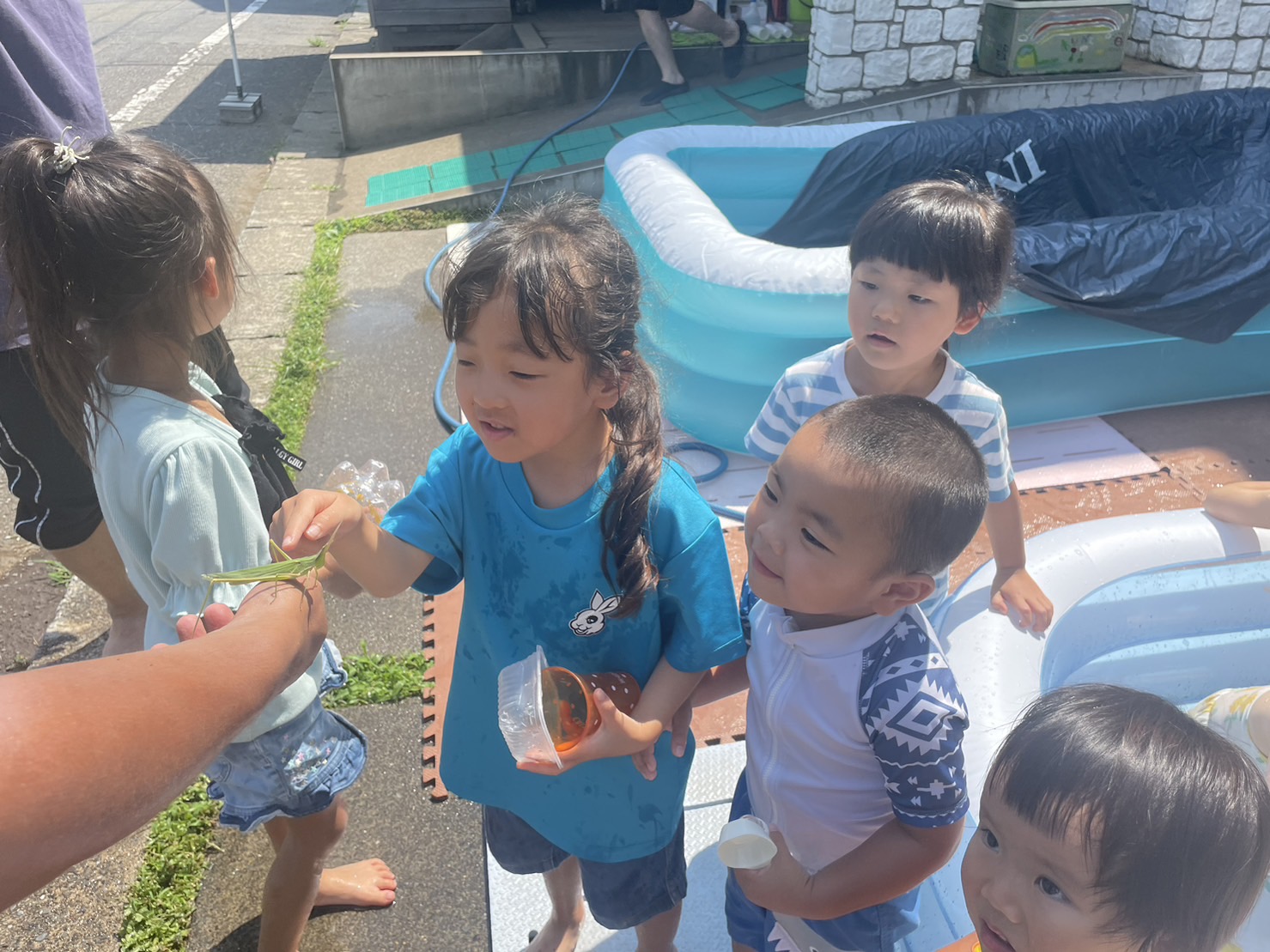 今日も暑い一日でしたね…!!みんなで水遊びをしていると目の前の畑にいたという大きなバッタを見せてもらいました♪大きなバッタに興味津々の子ども達でした♪