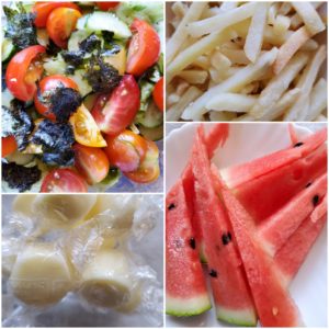 ☆レタスのりサラダ(畑で採れたトマトもプラスしました)☆ポテトフライ☆キャンディーチーズ☆スイカ