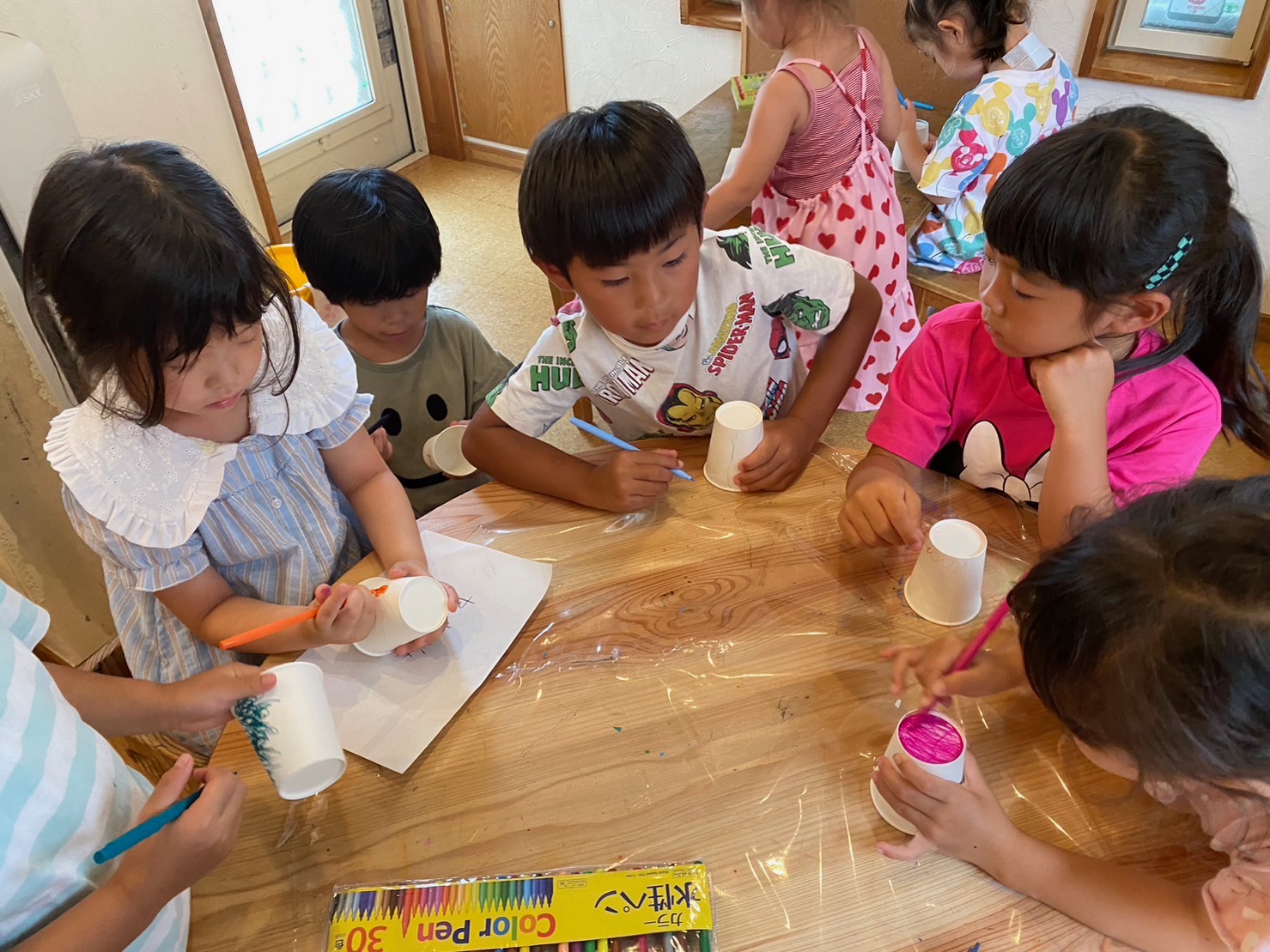 今日は不安定なお天気だったのでお部屋で過ごしました。アトリエでは紙コップロケット作りを楽しむ大きい子達🚀