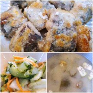 ☆鯖のパリパリ焼き☆胡瓜とキャベツの浅漬け☆茄子とわかめの味噌汁