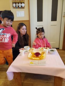 今日は今年度最後のお誕生日会を開きました。子ども達に協力してもらい、バースーカードや主役席のプレートなどを用意しささやかではありますが、心を込めて3月生まれのお友達をお祝いしました。内緒で用意したので喜んでくれてたら嬉しいな☆一つ大きくなった喜びを自信に変えて、良い成長を見せてくれることと思います!4歳のお誕生日だよ♪私の好きなベルのカードだ♡バースデーランチは大きい子が考えたメニューを参考にしました。発表は年中さん!お母さんと一緒にランチを楽しんでもらいました(*´∀`*)