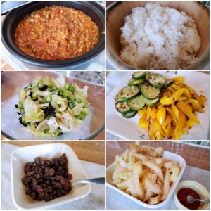 ☆夏野菜カレー(パプリカとズッキーニのトッピング)☆レタスのりサラダ☆ポテトフライ☆レタスのりサラダ☆レーズン