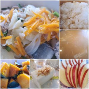 ☆鯖と野菜の蒸し煮☆玄米入りご飯☆えのきと大根の味噌汁☆南瓜の煮物☆冷奴☆りんご