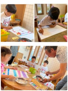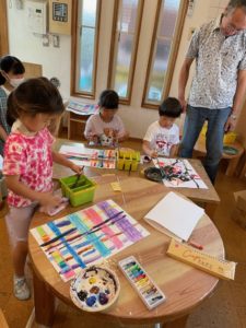 「絵の具は少しづつ出すんだよ」先生のアドバイスをよく聞いて自分で絵の具を用意したり筆を洗って違う色に変えたりして自分のイメージを楽しんでいました♪