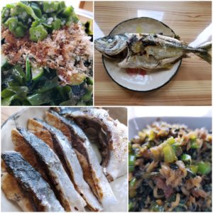 ☆シマアジの塩焼き☆ワラサの塩焼き☆生わかめのサラダ☆しらすのふりかけ