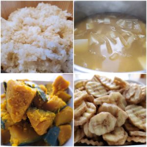 ☆玄米入りご飯/白米☆大根と豆腐の味噌汁☆蒸かし南瓜☆バナナチップ