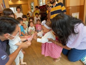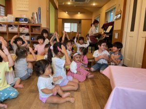 朝の集いでいつも歌っている♪大きな栗の木の下で♪を、みんなで歌ってプレゼントしました。