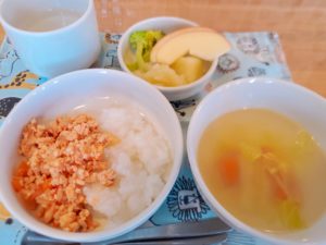 ☆軟飯☆チキンビーンズ☆キャベツのスープ☆じゃがバター☆茹でブロッコリー☆りんご
