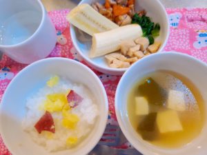 【完了期】☆さつま芋ご飯(軟飯)☆豆腐とわかめの味噌汁☆秋野菜と鶏肉の炒め物☆小松菜のお浸し☆高野豆腐の煮物☆バナナ