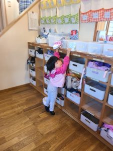 朝の支度をしている2歳児の女の子。食事用のタオルをカゴに入れようと手を伸ばしてみましたが、〝う~ん‥届かない‥〟