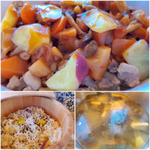 ☆さつま芋ご飯(玄米入り)☆豆腐とわかめの味噌汁☆秋野菜の鶏肉の炒め物