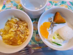 【完了期】☆カレーうどん☆おにぎり☆蒸かし南瓜☆小魚のやわらか煮☆みかん