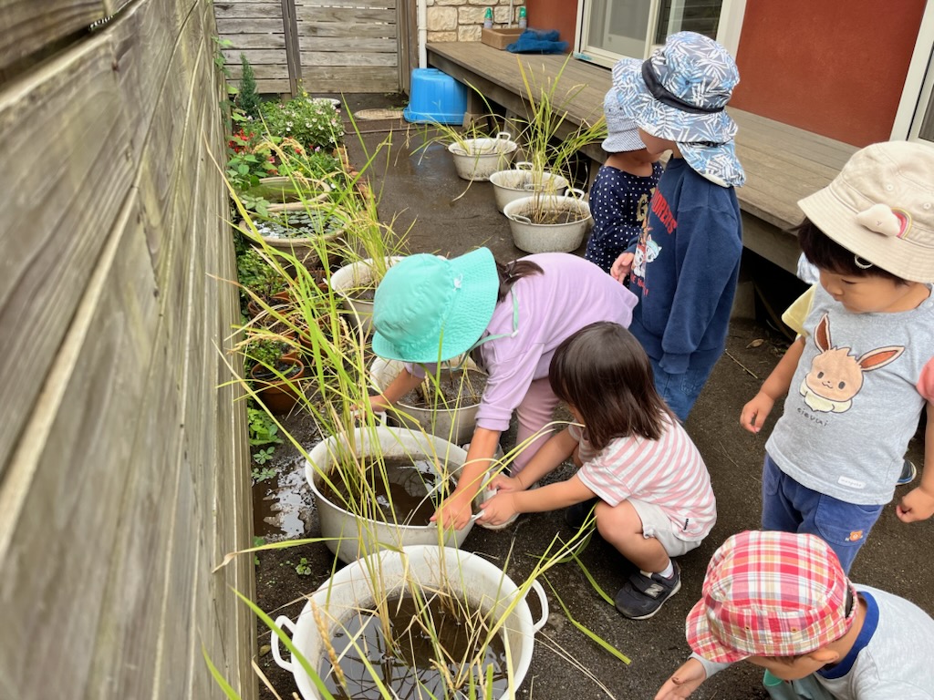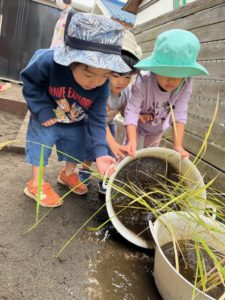 フレフレふれんでぃー練習の合間に3歳児の子ども達が稲のお世話をしました♬