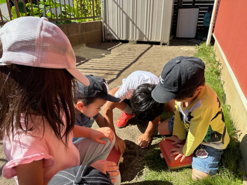 お庭に出るとさっそく何かを見つけた大きい子たち。なんとイモリを見つけたそうです!!