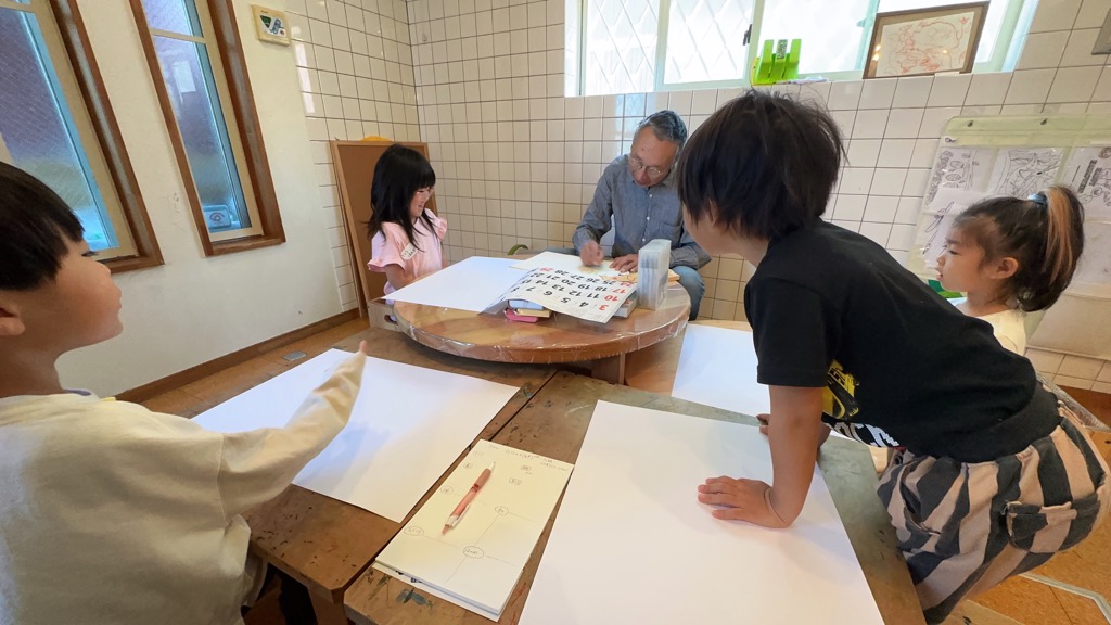 今回のテーマは”数字を書いてみよう”といったものでした。材料は白い大きな画用紙に様々な種類のペンやクレヨンでした。