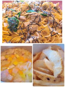 ☆チキンとほうれん草のパスタ☆根菜とベーコンのスープ☆ポテトフライ