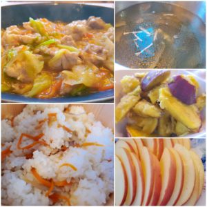 ☆秋の炊き込みご飯☆えのきとわかめのスープ☆鶏キャベツのとろみ炒め☆蒸かしさつま芋☆りんご