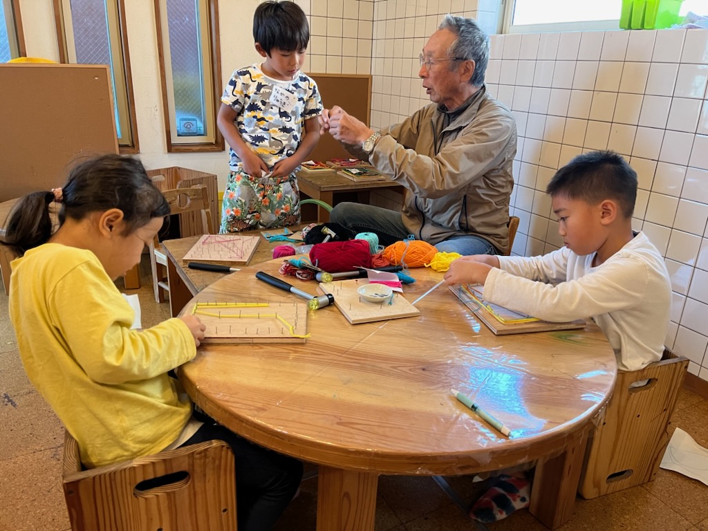 好きな色の毛糸を組み合わせ、釘に引っ掛けていきます。毛糸が抜けないように釘に結んでスタートし最後も結んでおしまいにするのですが、最初は上手く出来ず、「あー!ムズイ!」と言いながらも根気よく挑戦し、最終的にはどの子も自分で出来るようになっていました👏ものすごく集中力のいる造形でしたが子ども達の表情は達成感に満ちていました✨