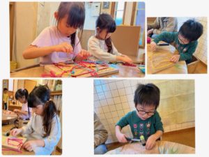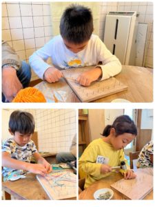 あらかじめ打ち跡がついている板に自分で釘を打ち込んでいきます。初めて釘打ちをする子がほとんどでしたが、自分で気を付けながら打つ事が出来ていました。順番に横一列づつ仕上げる子もいれば、ランダムに打つ子がいたり、打ち跡のない場所にも釘を打ち始め、なんと30分も釘打ちに没頭する子もいました😀
