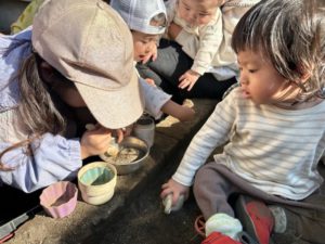 お店屋さんごっこをして「くださ~い」「ちょっとまってね~」とやり取りをしながら大きい子も小さい子もみんなでのんびり過ごしました♪