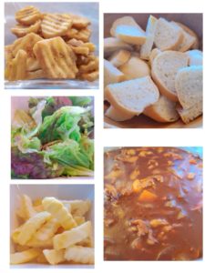 ☆豚肉ときのこのブラウンシチュー☆手作りパン☆レタスのりサラダ☆ポテトフライ☆バナナチップ