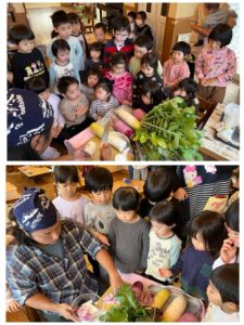 そして収穫祭の前に大きい子達が収穫してきた青首大根とむらさき大根を目の前で調理☆あっという間に大根スティックに変身!その包丁さばきに見とれていた子ども達でした😀野菜も切り方によって味が変わるんだという事を教えてもらい、食べ比べてみて、「ホントだ!辛くない」と、その違いに気がついたり。色んな事を発見したり感じた収穫祭でした。