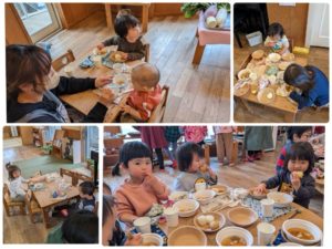 今日のランチの時間は、先日大きい子達が収穫した、さつま芋、じゃが芋、里芋の収穫祭をしました!