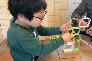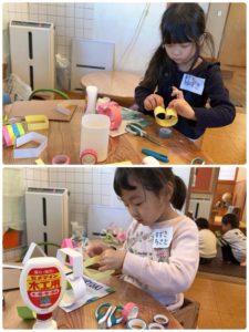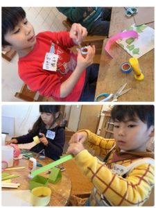 今回のアトリエの日は、長細いテープを使って〇、△、□と色んな形に折ってみてそれを組み合わせて繋げていく内容でした。