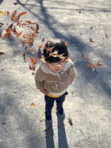 「葉っぱパーティーだ~♪」と言いながら落ち葉で思い切り遊んでいた子ども達です!!