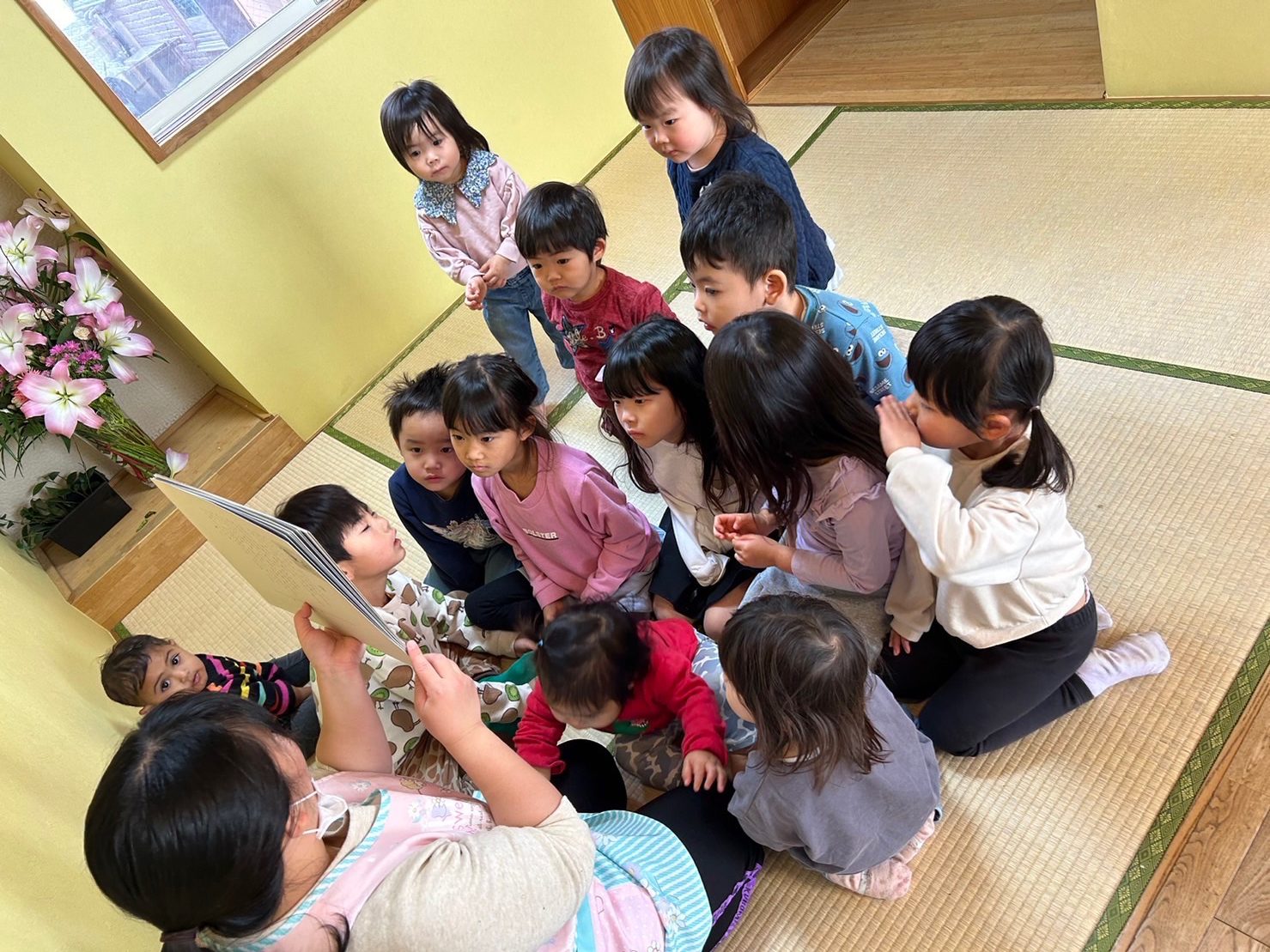 今日は内科検診があったので、順番を待ちながらお部屋で過ごしました。「紙芝居読もうかな…」というと喜んで中和室に集まる子ども達でした🤗