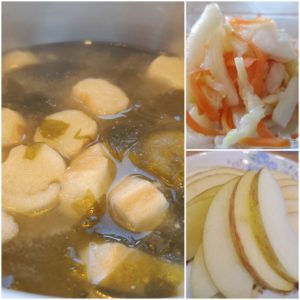 ☆わかめとお麩の味噌汁☆白菜と人参の漬物風☆りんご