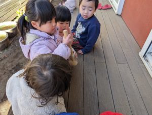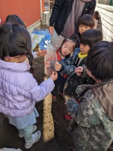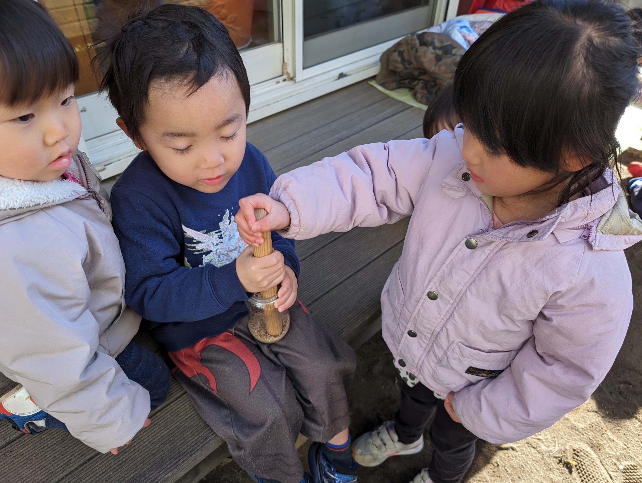 3歳児の子ども達と育てていた稲からお米を収穫する事ができたので精米をしています♪