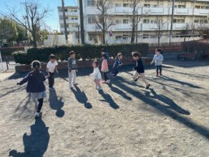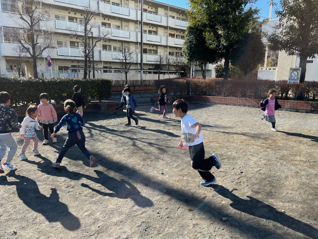 公園ではしっぽ取りを楽しみました♪ピンクチームとブルーチームに分かれ素早い身のこなしで逃げたりしっぽを追いかけたりしていました😁 まさに〝子どもは風の子元気な子〟ですね!