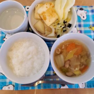☆軟飯(おかか)☆豚汁☆鶏汁☆豆腐のソテー☆粉ふき芋☆キャベツの海苔和え☆りんご