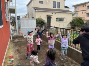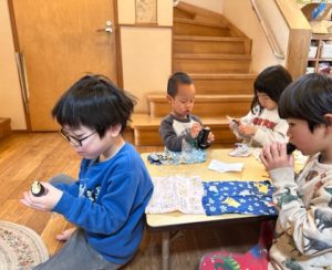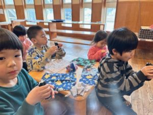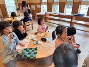 今年は年長さんがどんぐりのみんな代表で部屋の中の邪気やみんなからの邪気を「鬼は~外~福は~うち~!」と豆まきをしてくれました。邪気を払った後、玄関に鬼が嫌がる柊いわしを飾って終わりにしました。