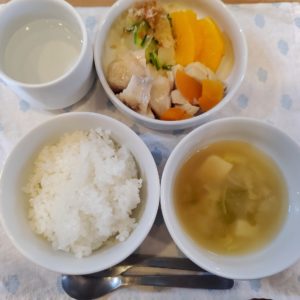 【後期】☆軟飯☆白菜の味噌汁☆鱈の煮魚☆高野豆腐煮☆大根と胡瓜のおかか和え☆オレンジ