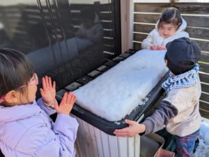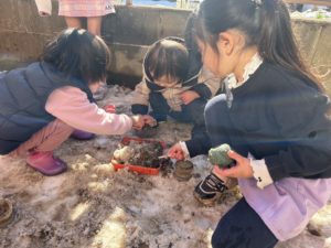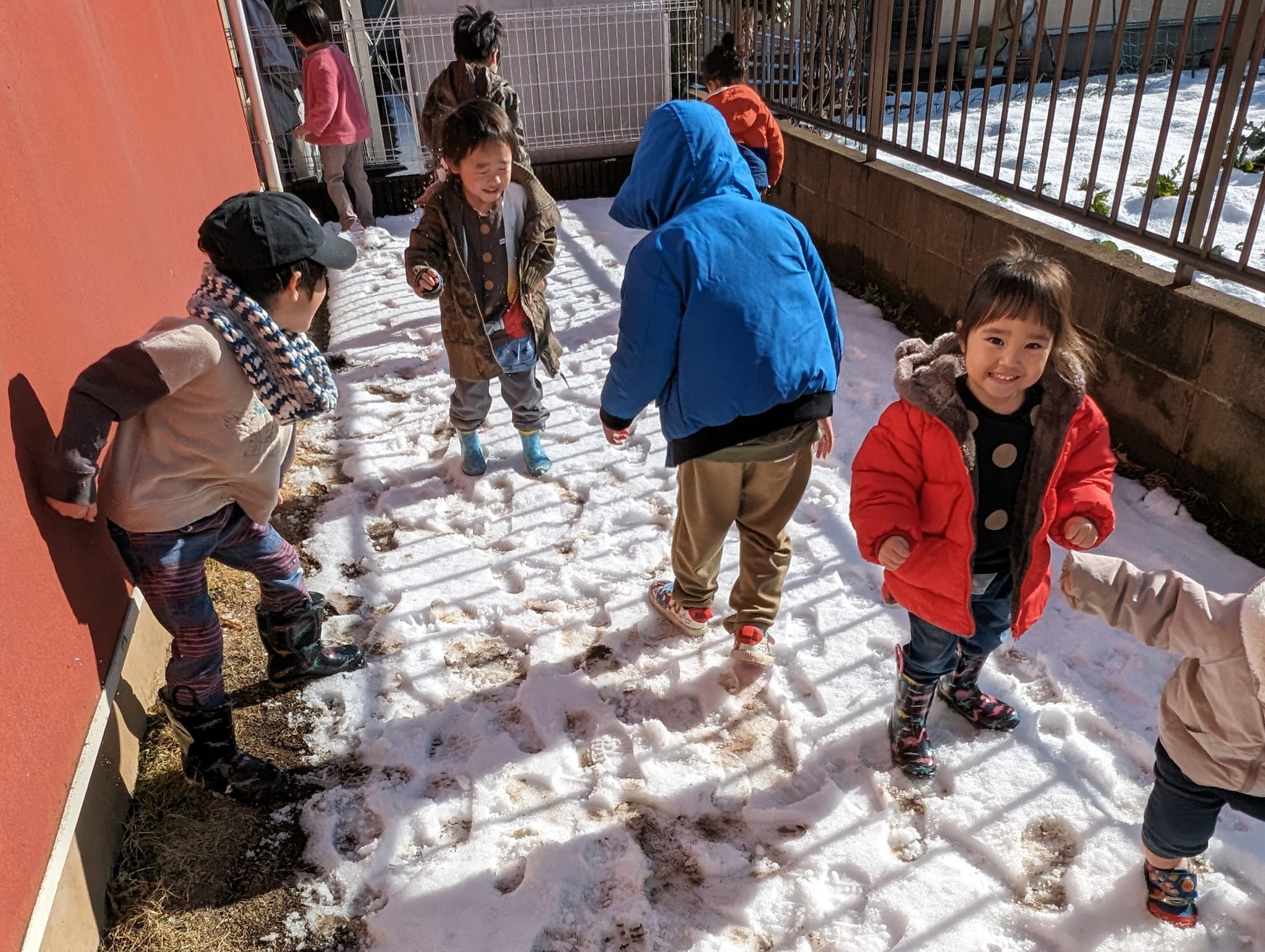 今週は月曜日のお昼ごろから雪が降り始め東京でも2年ぶりに積雪しましたね!!お庭に出るとまだ雪が積もっていたので雪遊びを楽しんだ子ども達です♪