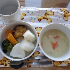 ☆春キャベツと鶏肉のクリームシチュー☆軟飯おにぎり☆茹でブロッコリー☆蒸かしさつま芋☆オレンジ